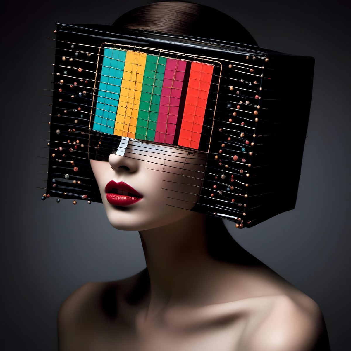 A surreal artwork of a woman with a television for a head. This image evokes the style of Dada and Surrealist art, created through mixed media and digital disruption.
