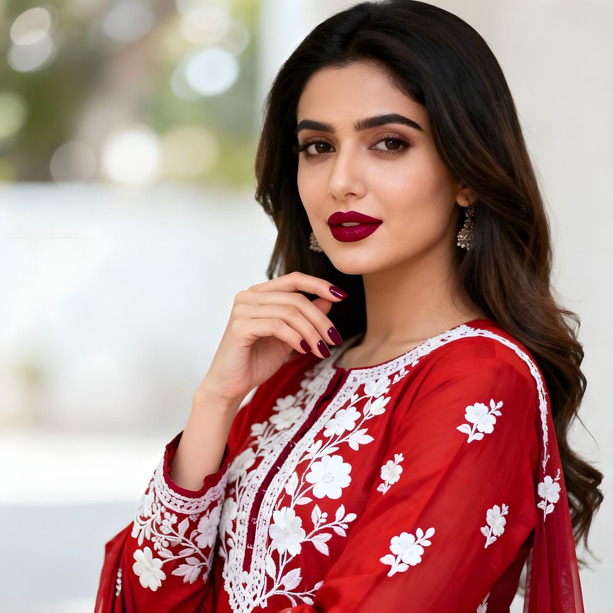 This portrait photography showcases a Pakistani model in a traditional red kameez salwar with white floral embroidery. She has an elegant, natural look with matching makeup and a graceful pose.