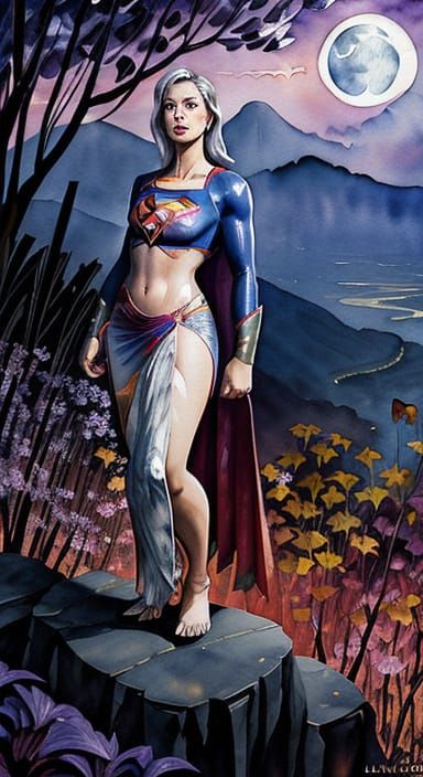 This image shows a beautiful, watercolor-style portrait of a woman wearing a sarong, set against a stunning mountain landscape under the light of a silvery moon. The artwork is characterized by its intricate details and hyper-realistic features, blending elements of fine realism and magical realism.