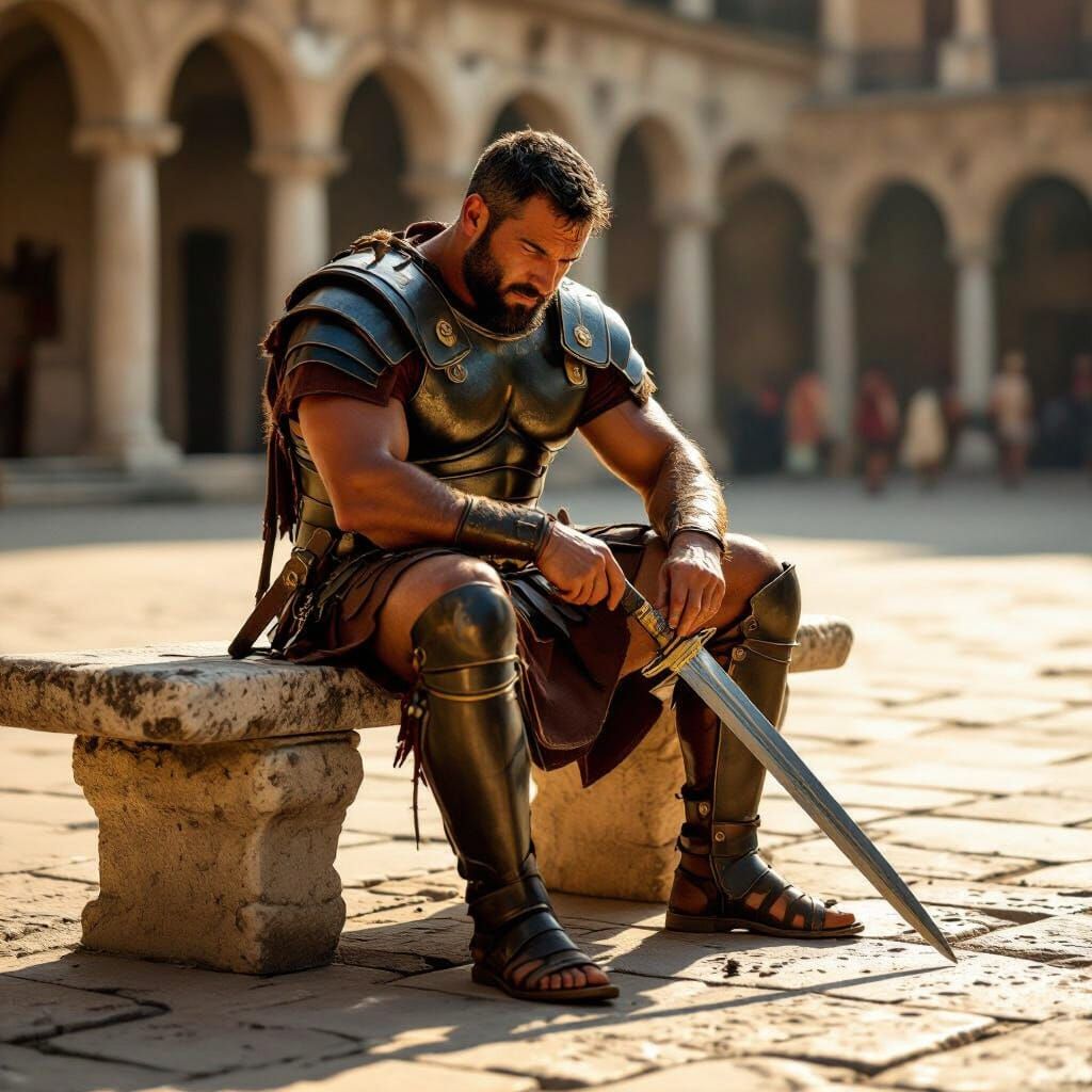 This image shows a battle-hardened Roman soldier carefully cleaning his sword in the warm afternoon sun. The scene features cinematic lighting and hyperrealistic detail, reminiscent of historical epics.