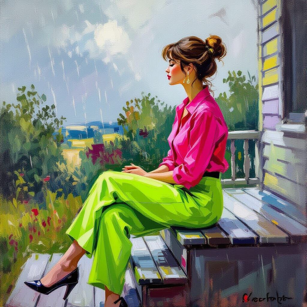 This image shows a teacher in vibrant clothing observing raindrops from a porch. The artwork evokes impressionist paintings through its vivid colors and bold brushstrokes reminiscent of masters of the era.