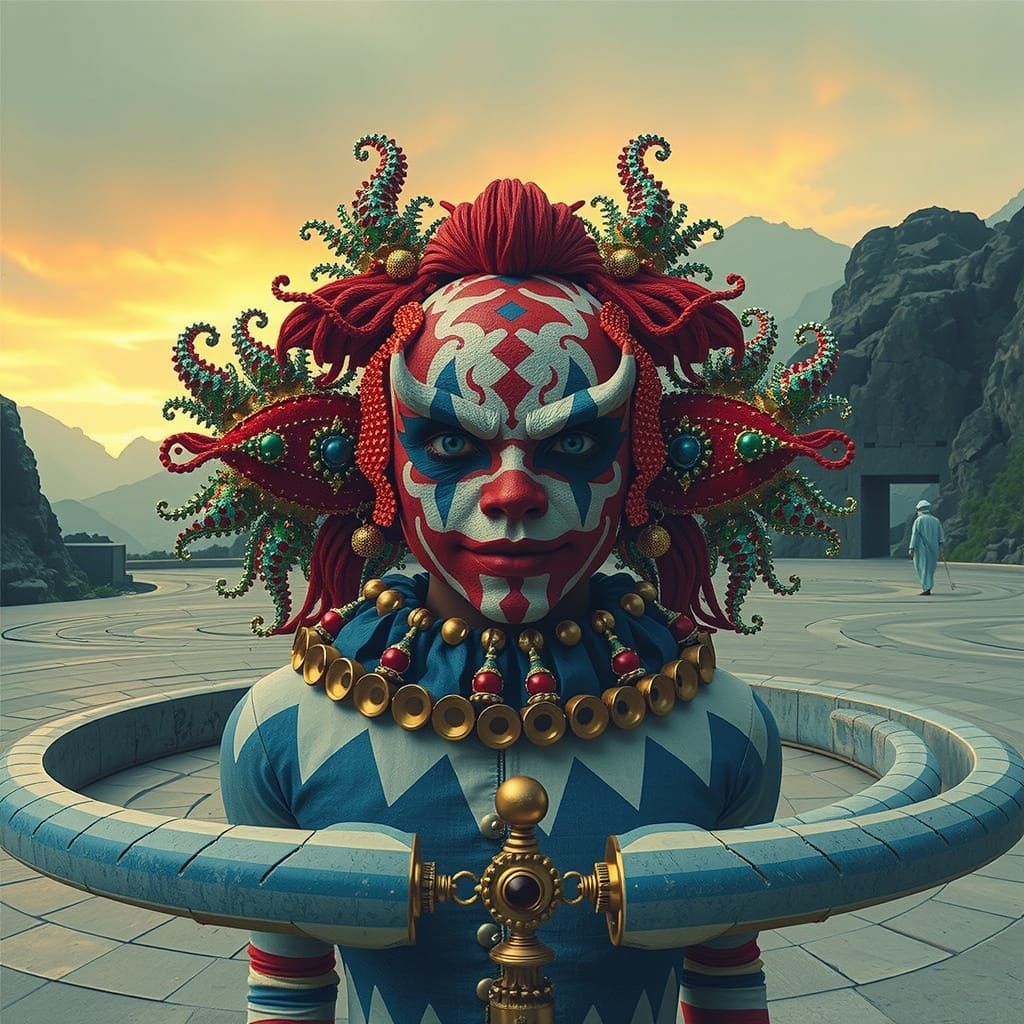 A vivid image of a harlequin in a geometric labyrinth. The figure wears vibrant colors and detailed patterns, set in an op-art style, creating a surreal effect.