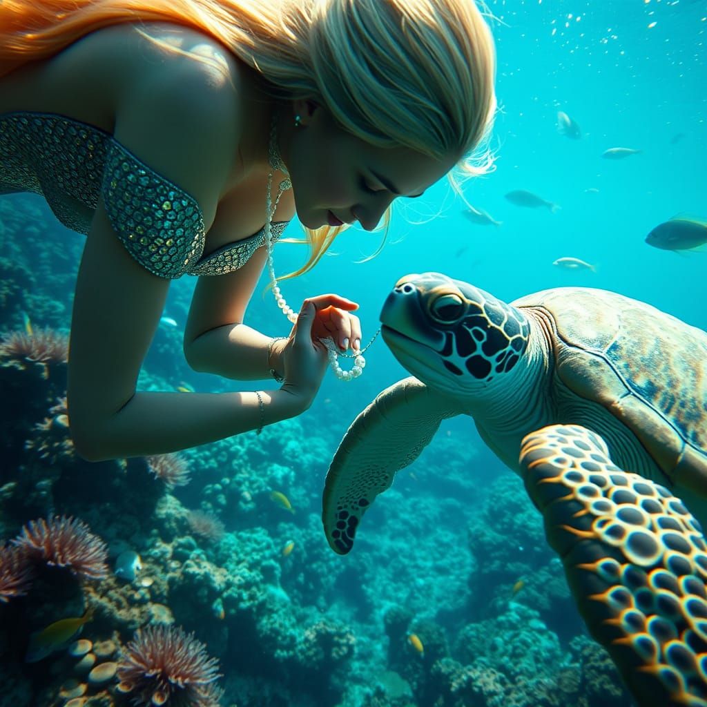 Mermaid's Gift to Sea Turtle đ§ââïžđą A mermaid giving a pearl necklace to a sea turtle in a coral reef, cinematic style.
