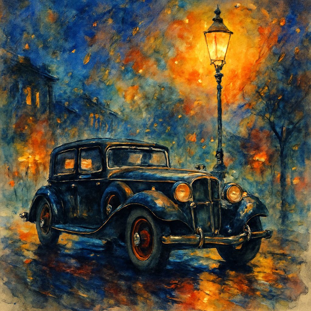 A stunning image of a classic black car under a streetlamp at night. The artwork is rendered with dynamic watercolor and ink techniques, with vibrant splashes of color and light.