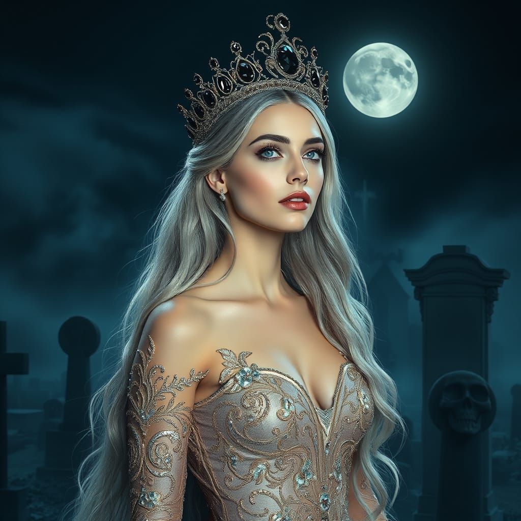 This image shows a beautiful woman in a lavish, glistening gown, wearing a crooked tiara and standing in a mist-shrouded cemetery at night, with a cinematic and atmospheric style reminiscent of hyperrealistic art.