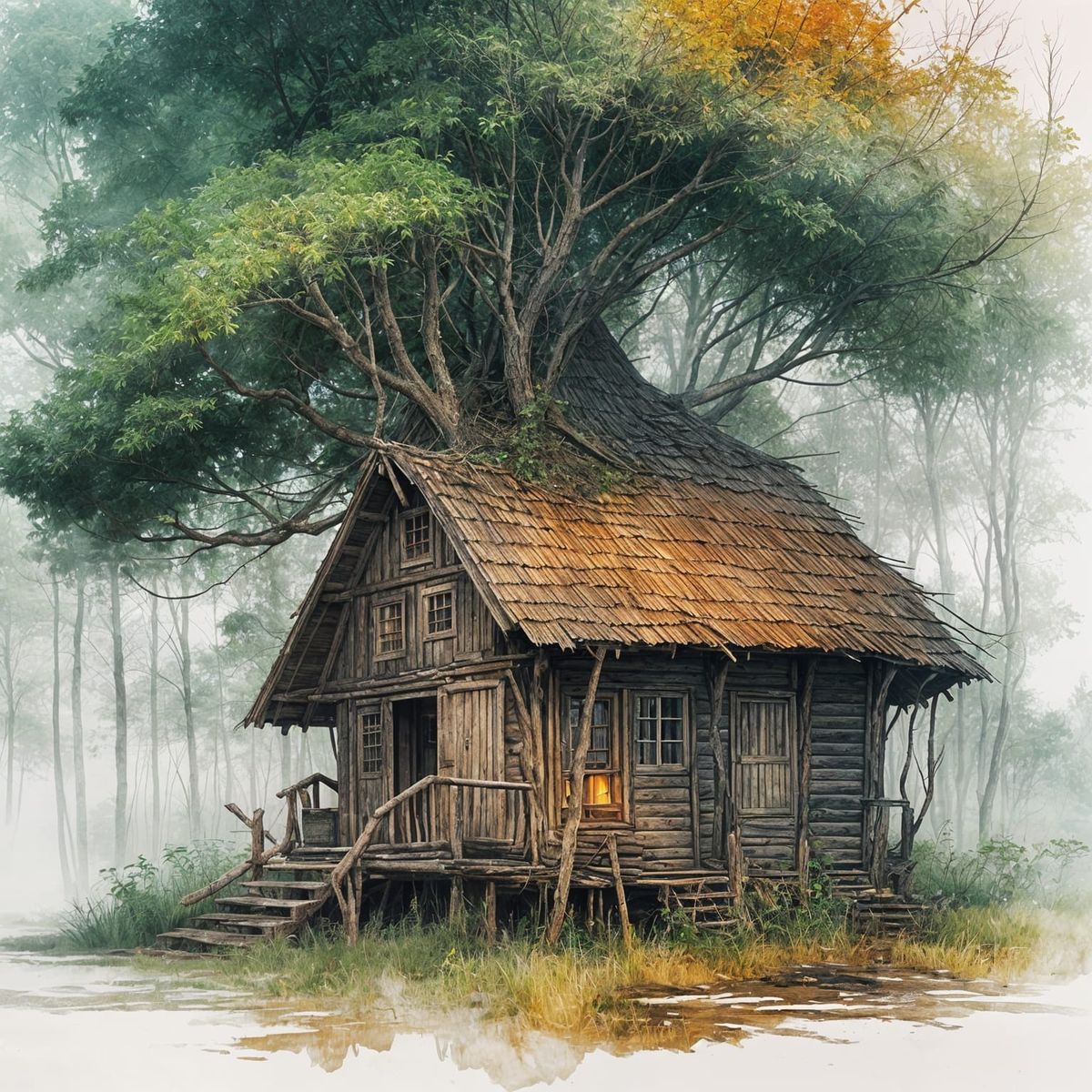 This image shows a mystical scene of Baba Yaga's hut, precariously perched on a gnarled chicken leg, set amidst a dark and shadowy forest