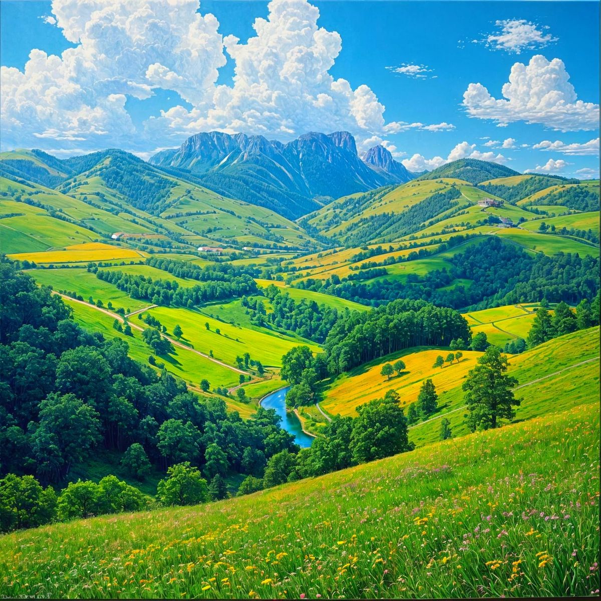 This image showcases a photorealistic acrylic painting of a picturesque landscape, featuring bright and vivid colors, mimicking the look and feel of a traditional artwork.