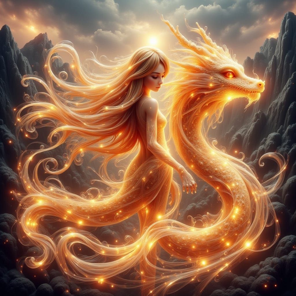 This image depicts a majestic dragon maiden with amber and gold tones, flowing hair, and sparkling eyes, set against a mystical mountain backdrop. Rendered in a cel-shaded anime style.