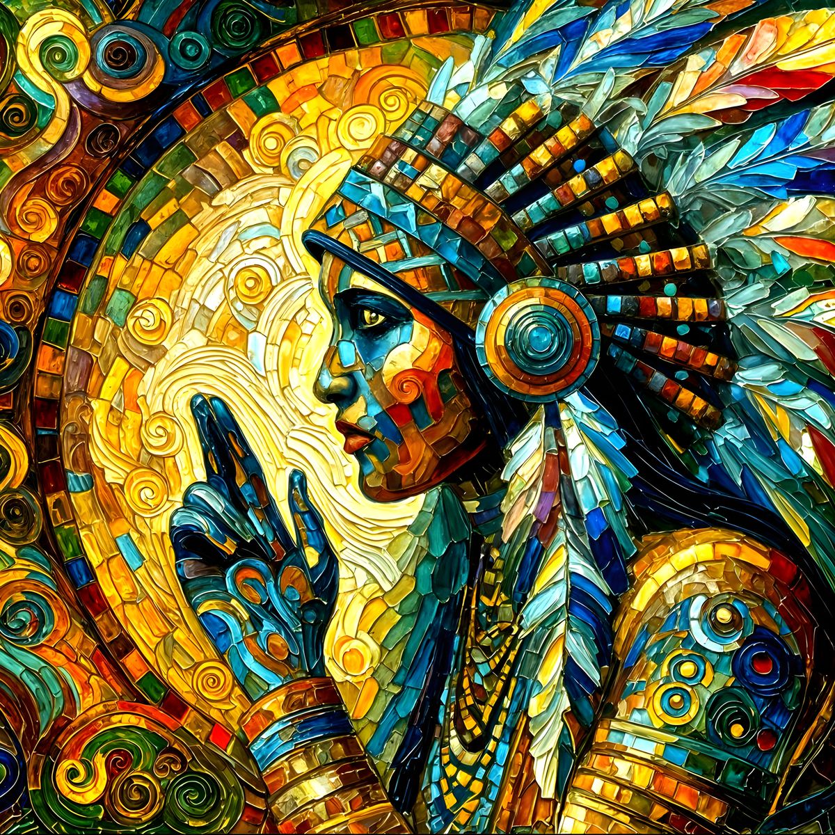 Create a filigree Indian Native in a style that combines neo-impressionism and expressionism, similar to the oil paintings popular before 1912, with influences of post-impressionist acrylic painting techniques, particularly utilizing thick layers of colorful textured paint and a smooth impasto style. ...