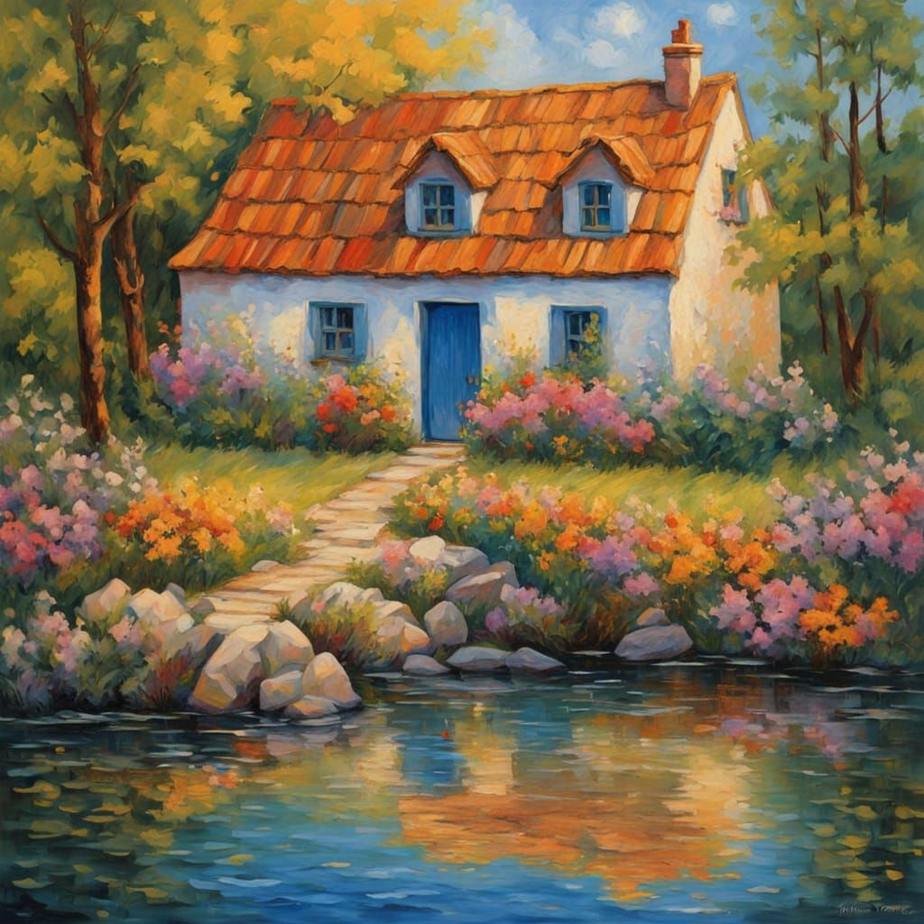A hyperrealistic image showing a sun-drenched cottage surrounded by wildflowers. Captured with intricate details and a sense of natural beauty using impasto techniques, thick layers of colorful textured paint in a post-impressionistic style.