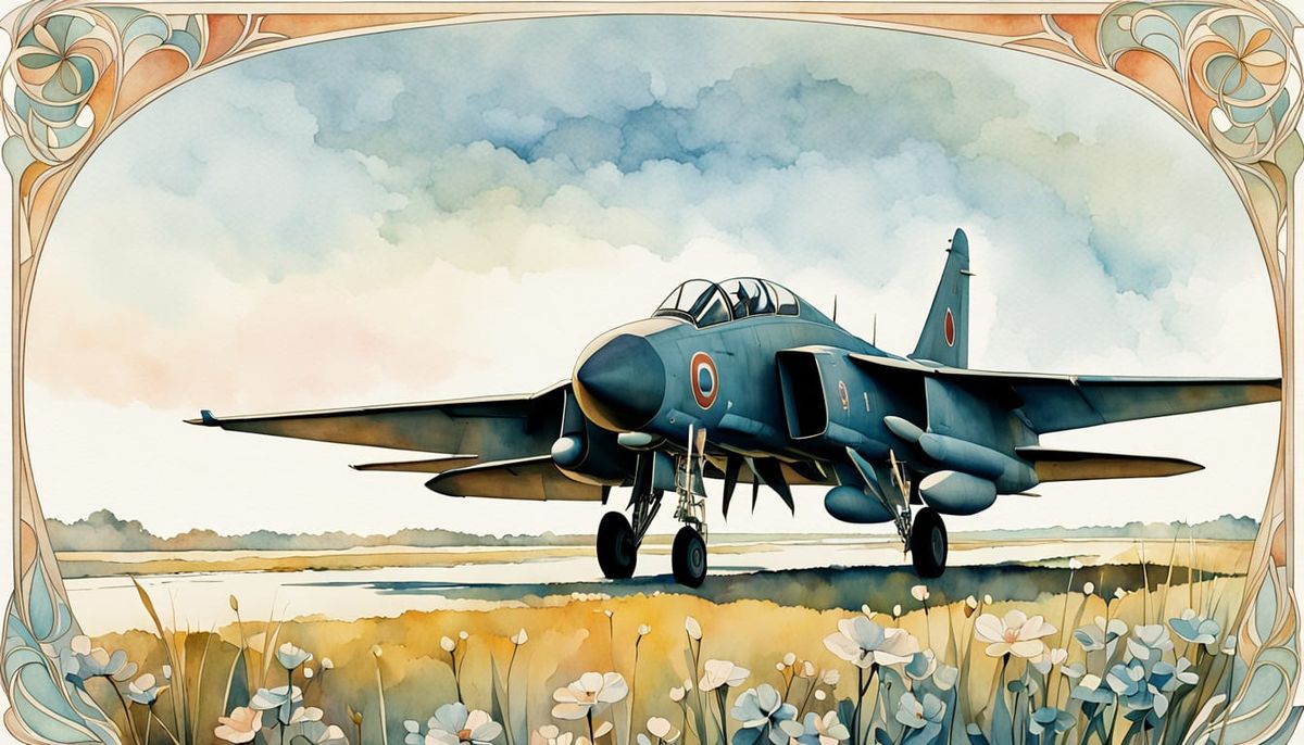 This image is a stunning watercolor painting in the Art Nouveau style, featuring a middle-aged man standing in front of two fighter jets amidst a lush, grassy field with blooming flowers in the foreground, set against a soft, natural light background with earthy tones and muted blues.