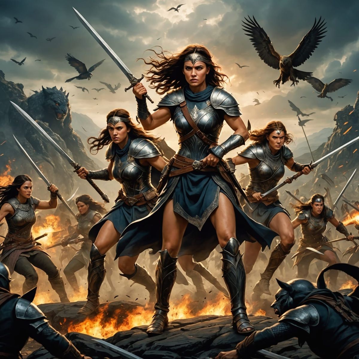 This image shows female warriors in battle, protecting other women from fantastical creatures. It depicts a scene of courage and strength, highlighting themes of protection and heroism.