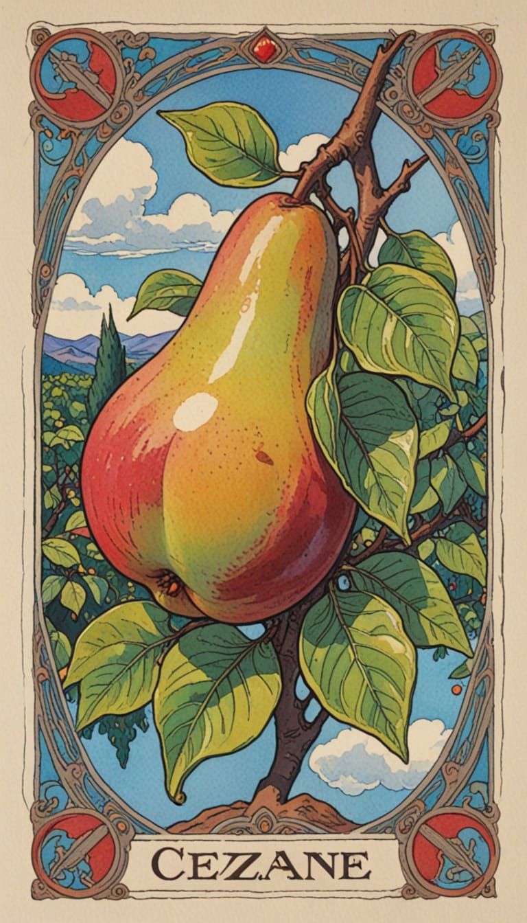 This vibrant image features a red Anjou pear presented as a tarot card, blending Art Nouveau elegance with retro comic book aesthetics and bright gouache colors.