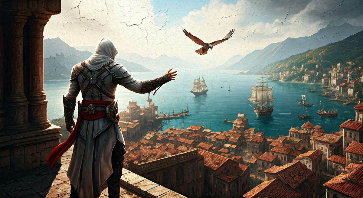 A dramatic impasto painting of an assassin on a rooftop, arm outstretched as a falcon approaches. Below, a medieval village meets the sea, rendered with rich colors and textures in an evocative style.