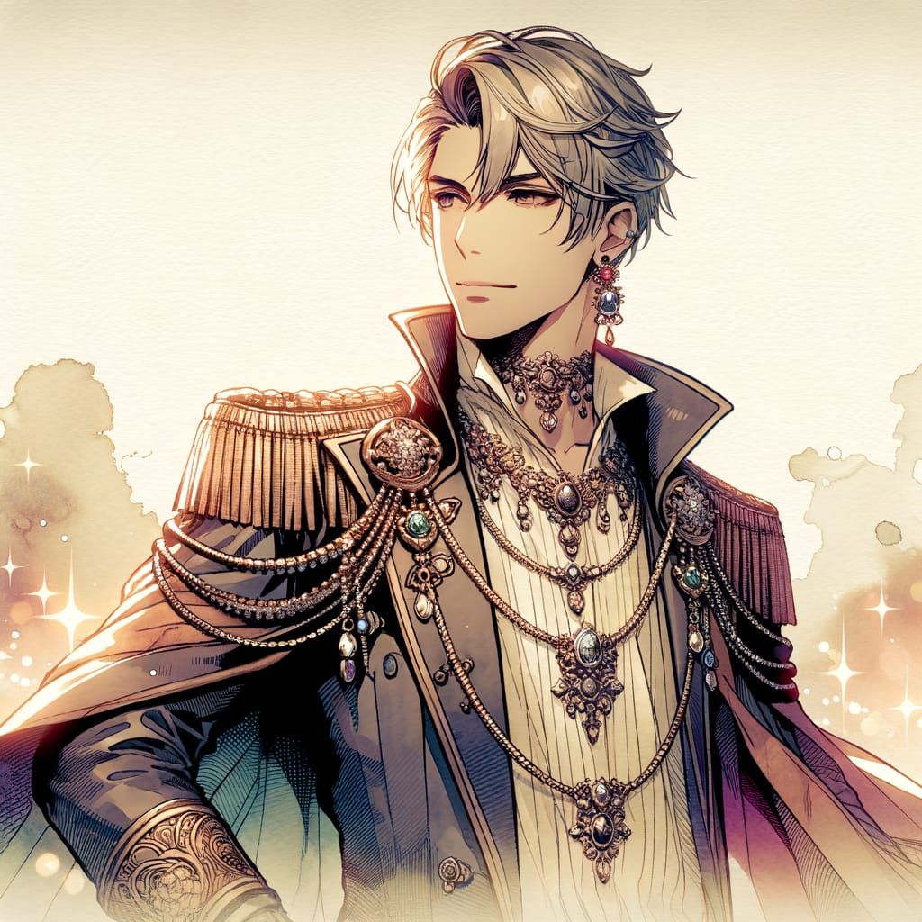 This image shows a confident middle-aged person in anime style. The character wears cool-toned clothing and elegant jewelry, set against a simple background with soft watercolor textures.
