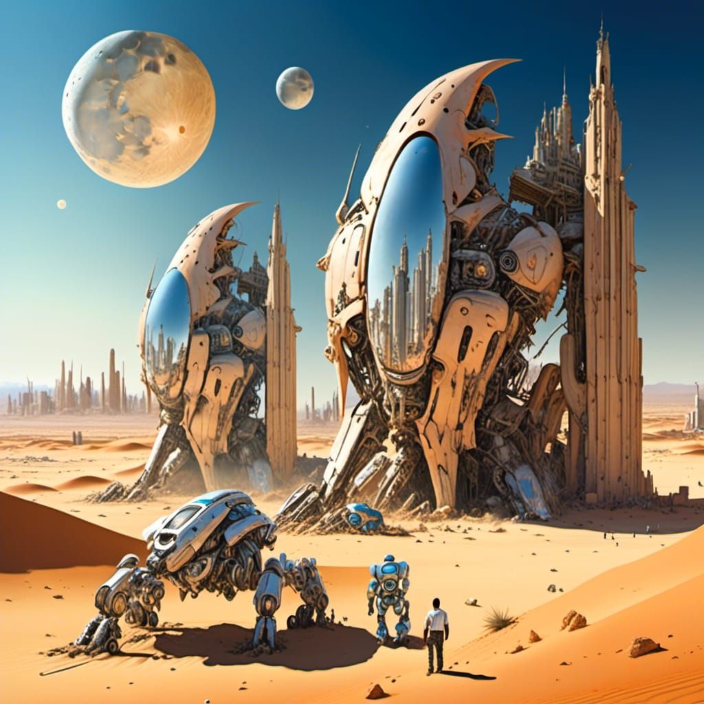 This image shows a futuristic alien city in a desert landscape. A giant robot repairs a building under a blue sky with orange moons. The scene is highly detailed with polished metal textures.