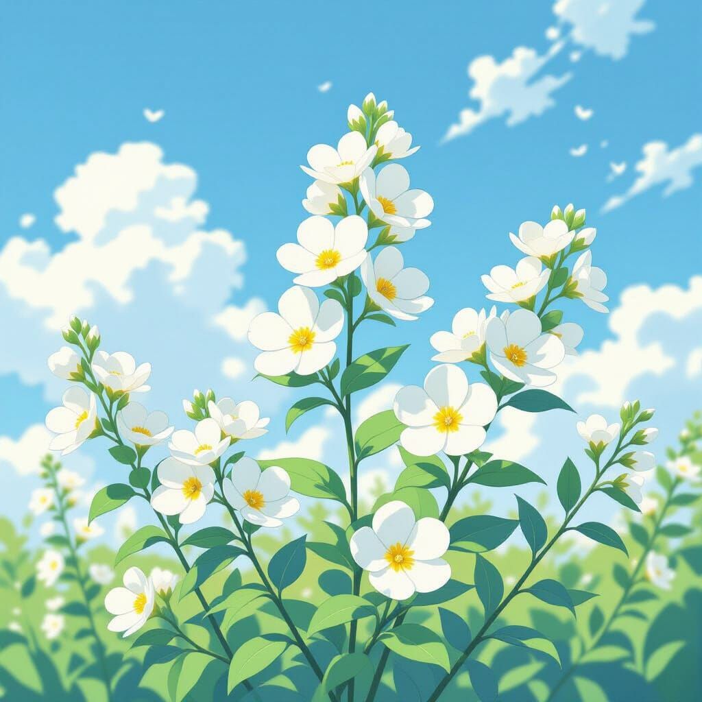 A vivid watercolor illustration of Mayflower blossoms against a bright blue sky. The artwork features a dreamy aesthetic with delicate details and soft shading, reminiscent of botanical illustrations.
