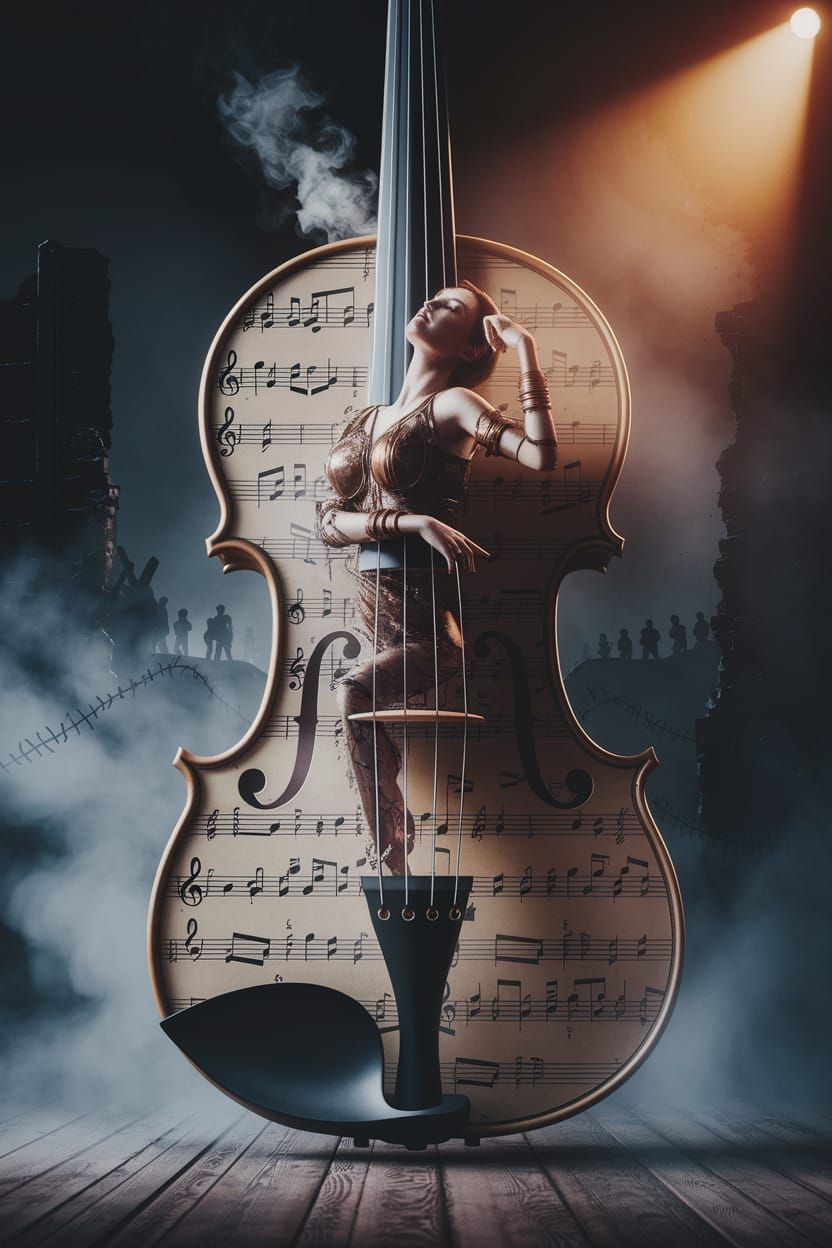 A striking picture of a steampunk mechatron dancing inside a giant violin. The double exposure artwork features translucent sheet music and war imagery, with dramatic lighting and intricate textures in a cinematic style.