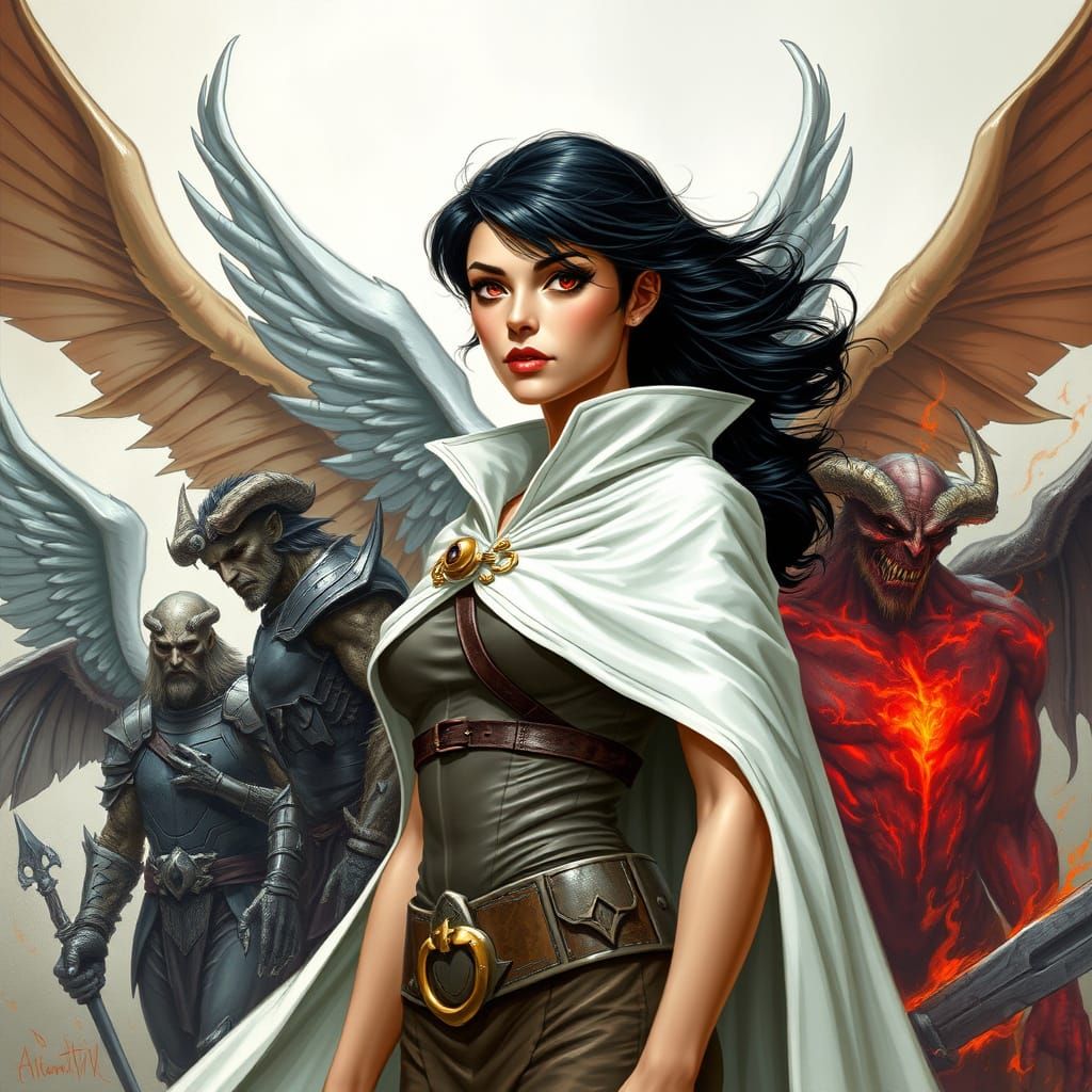 A striking picture of a heroic woman with heterochromia standing before archangels and demons. The image features bold lines, dynamic poses, and vivid colors in a dark fantasy art style.