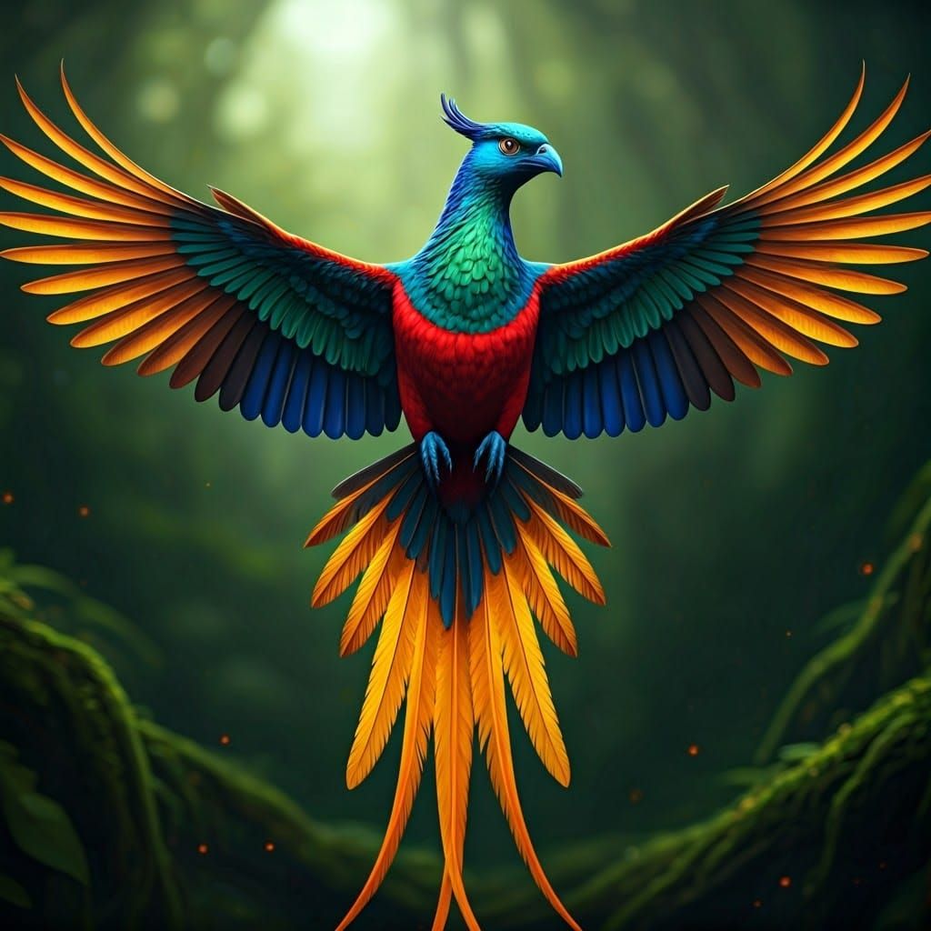A vivid image of a bird with colorful plumage and a long tail, wings spread against a lush green background. The bird is rendered with intricate textures and atmospheric depth, evoking fantasy concept art.