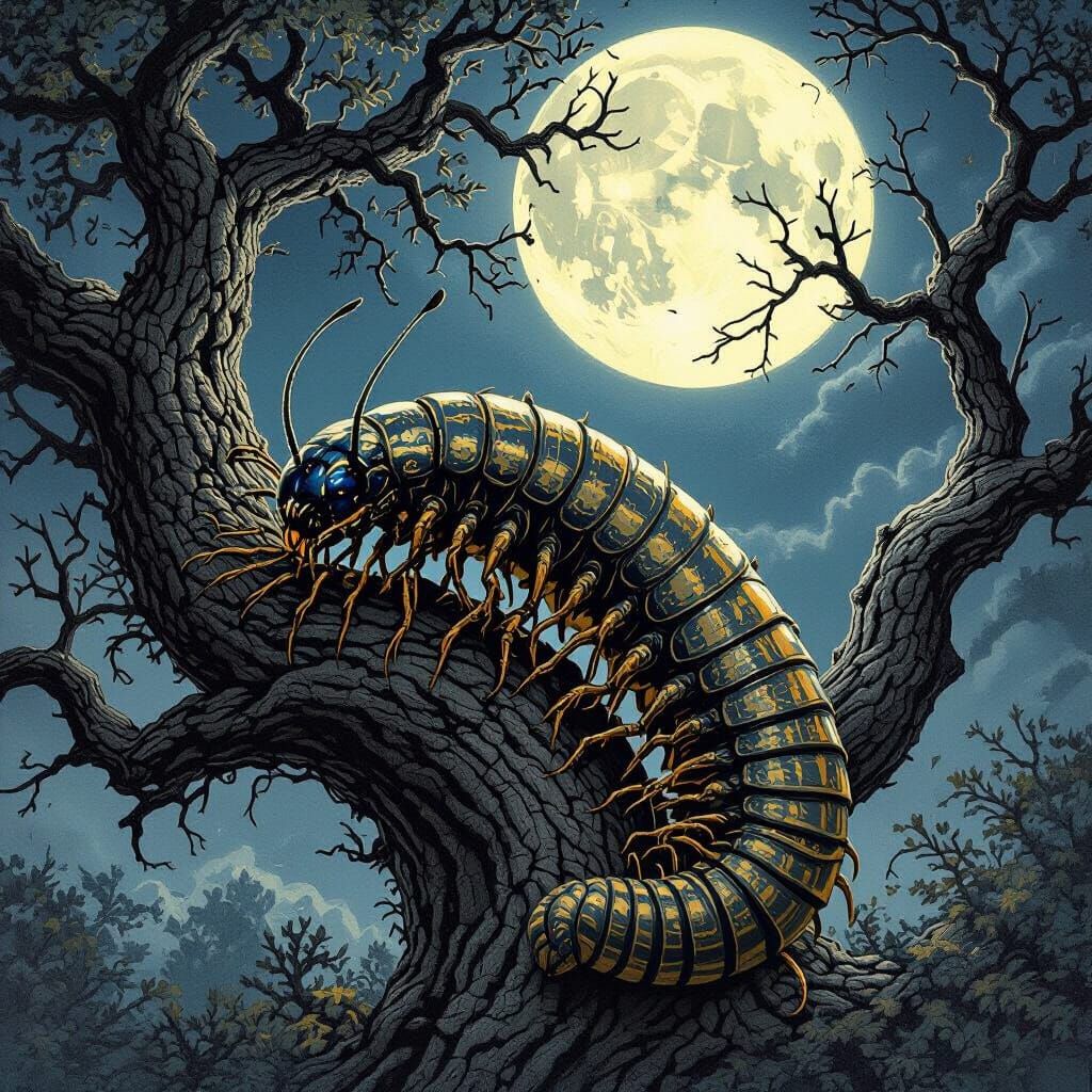 This image shows a bizarre jaguar-centipede hybrid creature climbing a tree beneath a full moon. The artwork features intricate details and shadows in a dark fantasy style.
