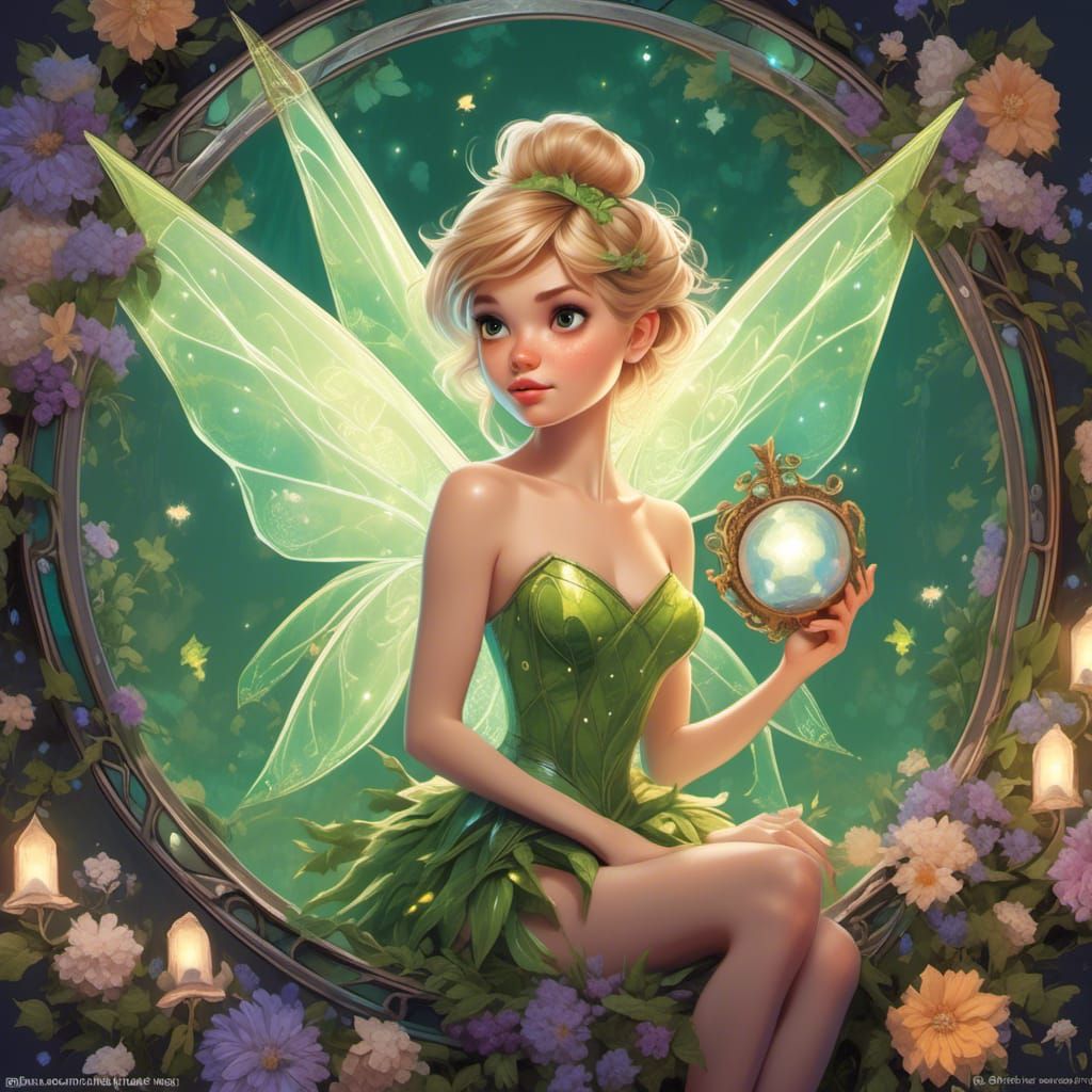 This image shows Tinkerbell holding a mirror in a dark fantasy setting. The 2.5D digital illustration features realistic art, chiaroscuro lighting, and glitter details with intricate and breathtaking detail.