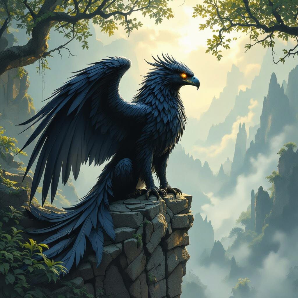 This dark fantasy concept art features a majestic griffin with obsidian feathers and molten gold eyes perched on ancient ruins above an enchanted forest. Dramatic lighting highlights intricate textures.