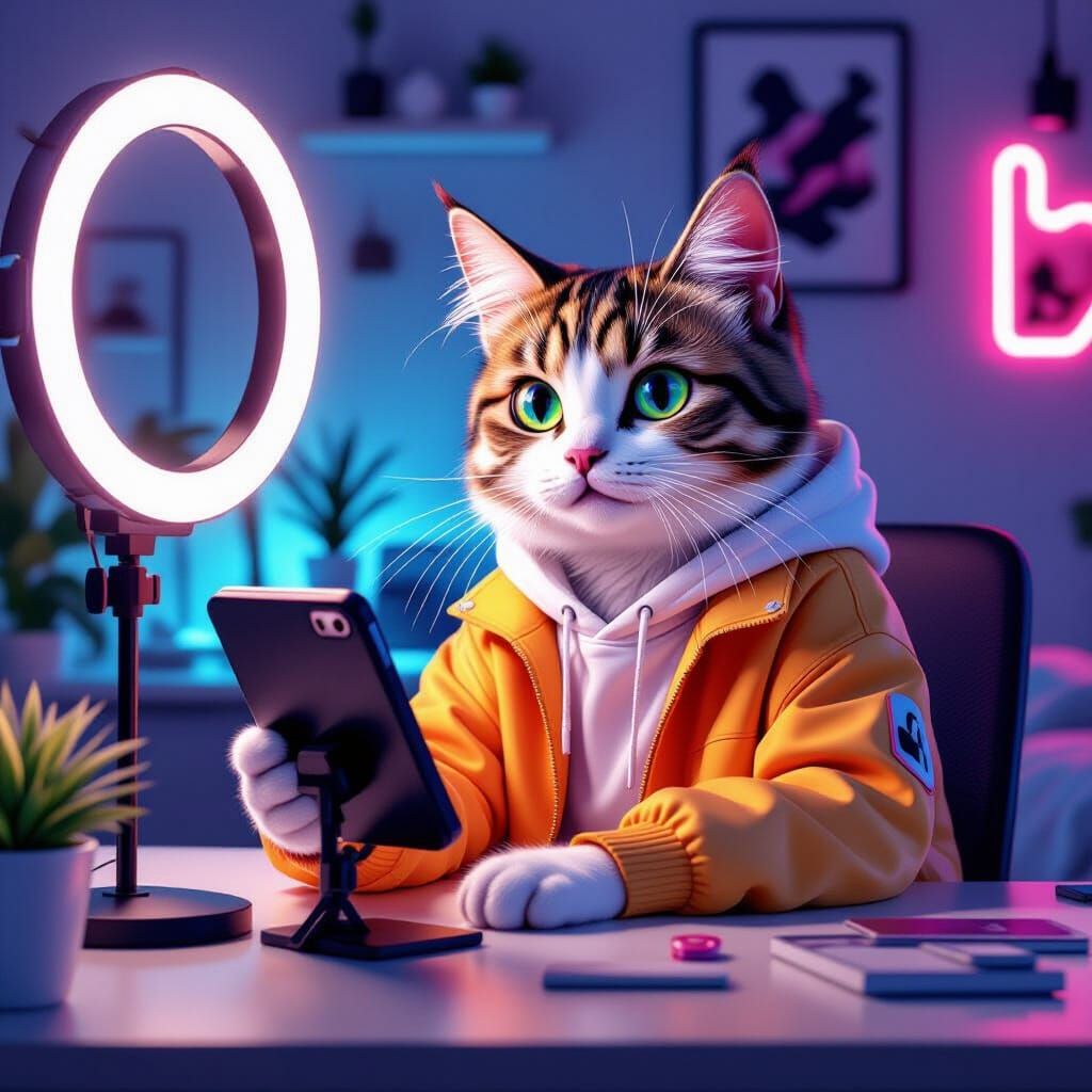 A photorealistic image of a Gen Z cat filming a TikTok video. The cat is wearing streetwear and makeup in a minimalist bedroom with neon lights, rendered with crisp lines and vibrant colors.