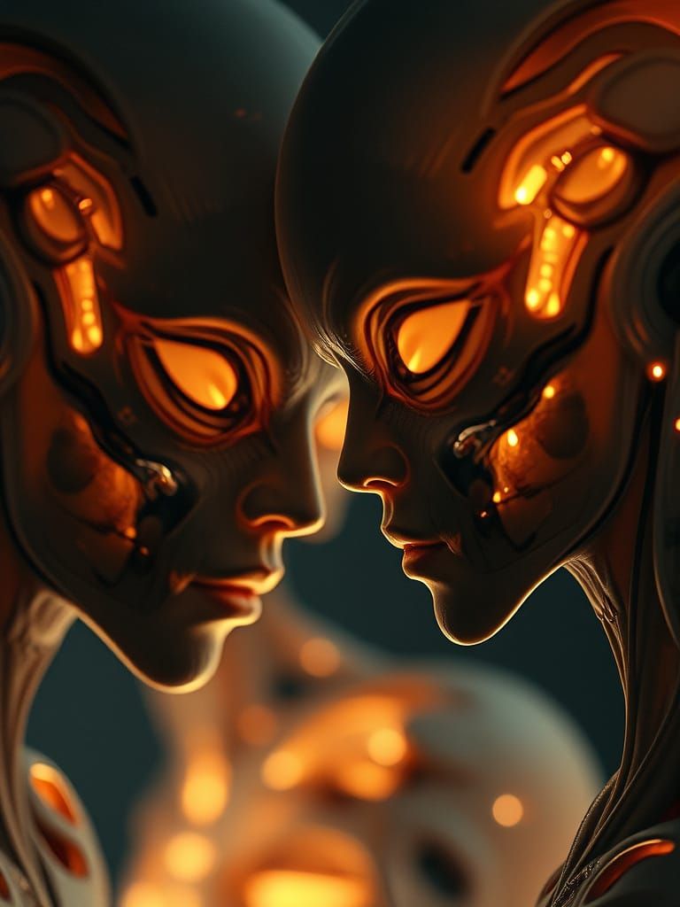 This image features dreamlike, biomechanical alien females in macro close-ups, illuminated by moody chiaroscuro lighting. The photorealistic style captures intricate details with a film grain texture and unsettling atmosphere.