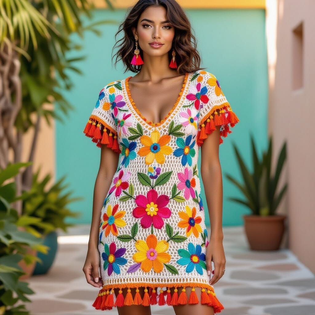 A vibrant, short crochet dress featuring floral patterns, tassels, and beads. The design evokes a playful and eclectic style, using bright hues to create a whimsical effect.