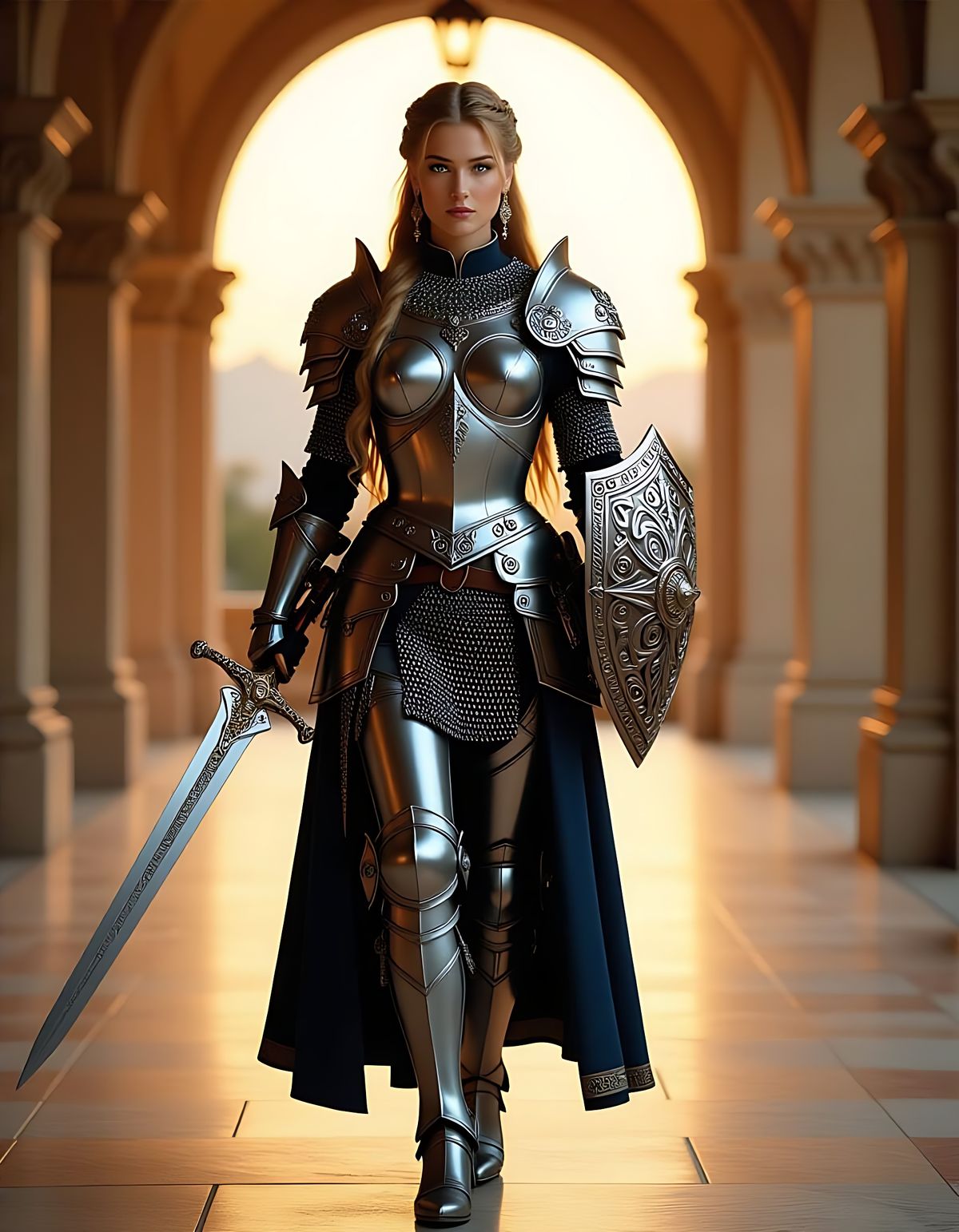 A photorealistic full-body image of a female knight with golden hair and blue eyes, wearing detailed silver armor. She walks through a grand hallway during golden hour, holding a sword and shield. Ultra-detailed, 8K.