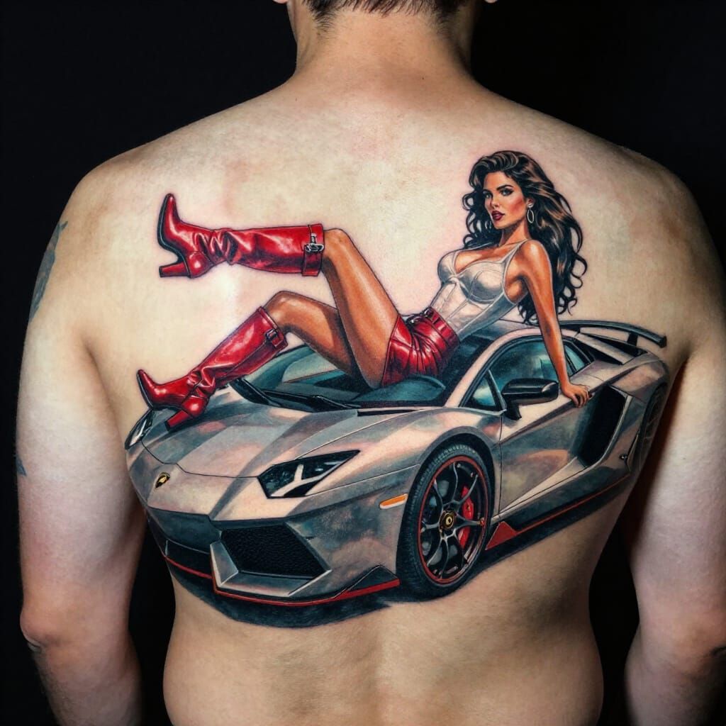 This image showcases a vibrant, realistic tattoo design of a woman in red boots and a mini skirt on a Lamborghini. Cinematic lighting and film aesthetics enhance the dramatic composition.