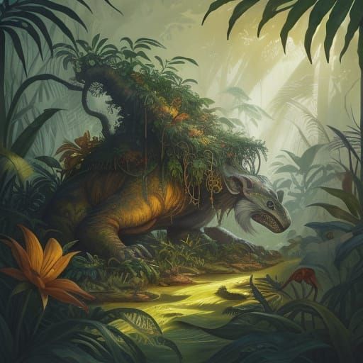 This image showcases a surreal children's book illustration of Max and the wild things in their lush, fantastical jungle home, featuring vibrant watercolor textures and emotive creature faces.