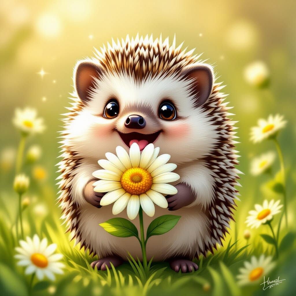 A charming image of a hedgehog holding a daisy flower. The artwork evokes a spring atmosphere through warm colors and cartoon-style photorealistic details, emphasizing whimsical elements and high contrast lighting.