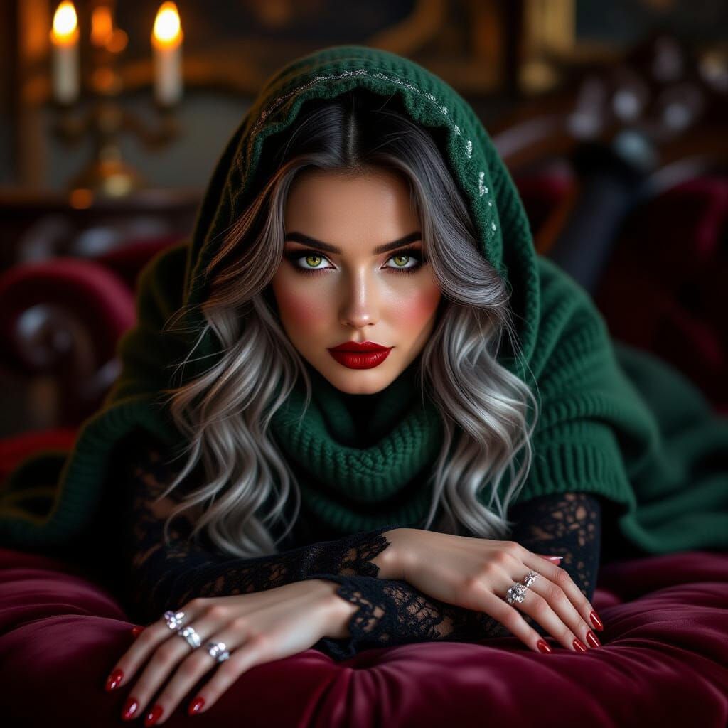 A captivating image of a gothic woman lying on a velvet ottoman. This striking artwork captures her complex emotions with dynamic candlelit lighting and soft focus in a watercolor aesthetic.