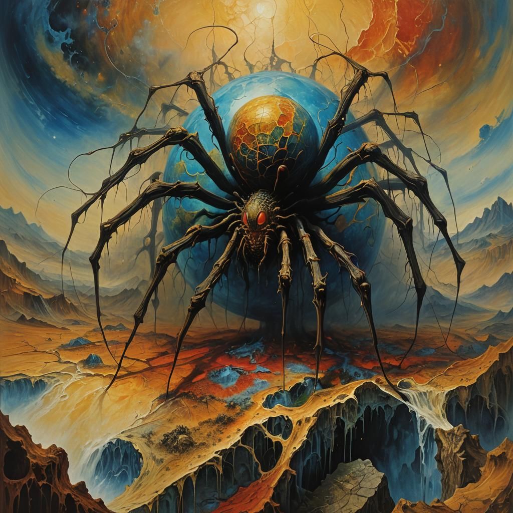 A surreal image of a giant spider enveloping Earth. This digital painting features dreamlike brushstrokes, thick textures, and vibrant colors with dramatic contrast in an ominous atmosphere reminiscent of melting oil on canvas.