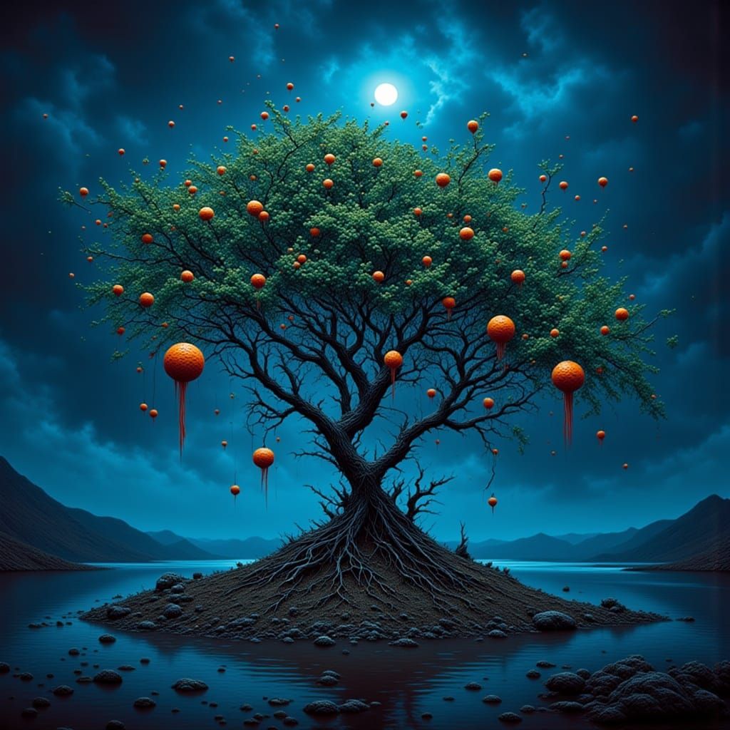 This image shows a spooky island scene at night, with dolls hanging from trees. The scene is photorealistic with volumetric lighting and a vibrant color palette, in a cinematic and atmospheric style.