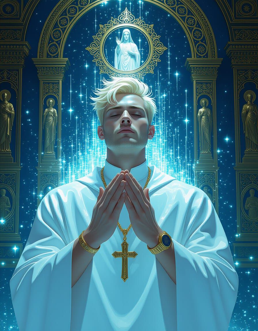 This image shows a blonde man frozen in a digital glitch, surrounded by religious icons. The artwork features a richly detailed matte painting style with deep blues and golden colors.