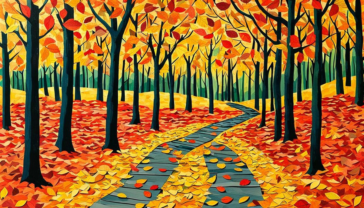This image shows a layered paper collage of an autumn forest path. Multicolored leaves cover the forest floor, accentuating the vibrant fall colors in this papercraft artwork.