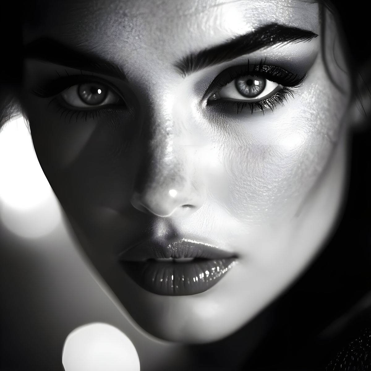 A striking black and white portrait captures a woman's intense, melancholic eyes reflecting a dimly lit ballroom. High-contrast lighting and dramatic shadows create a timeless, high-fashion editorial look.