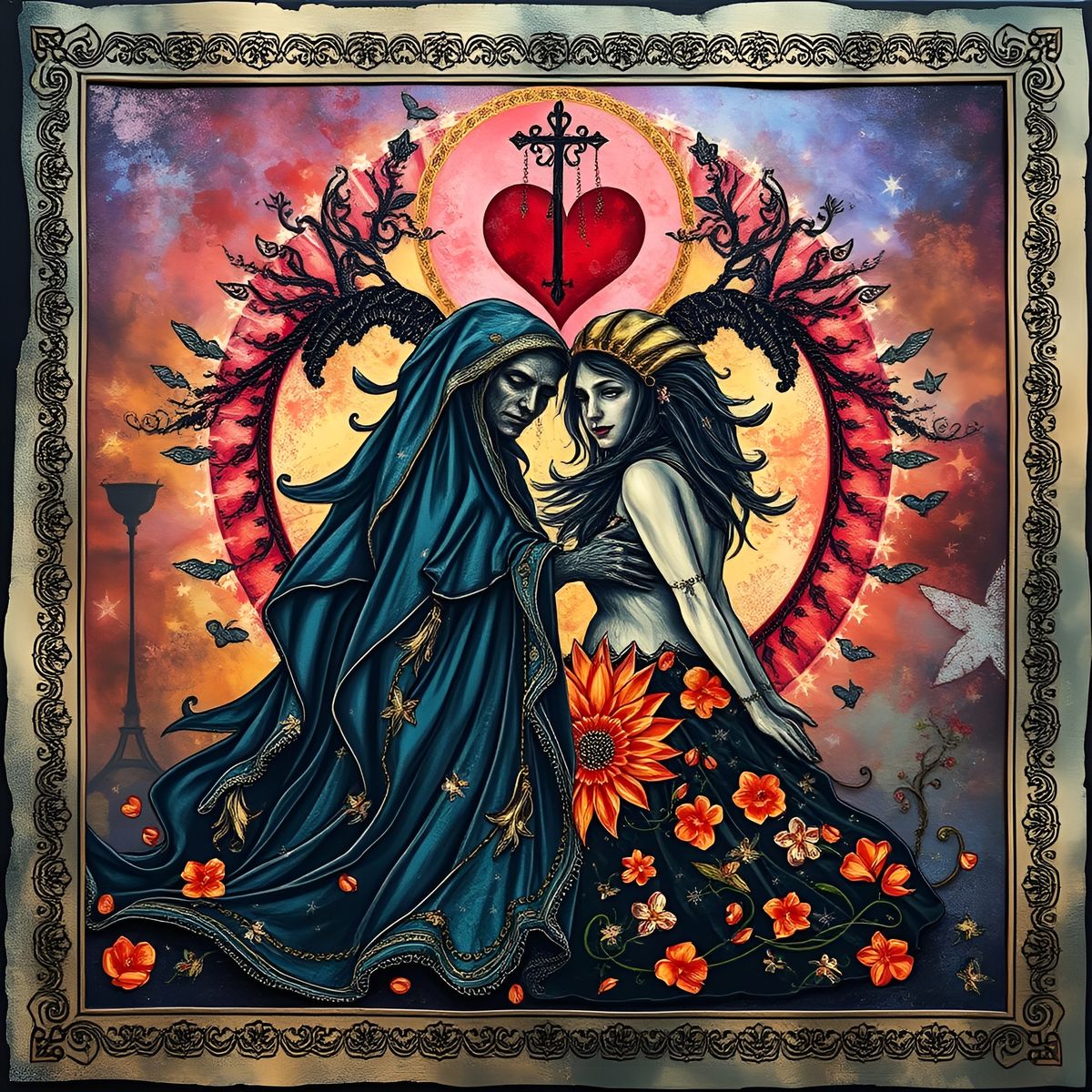 This evocative mixed media collage explores themes of fleeting love and disillusionment with a gothic aesthetic, featuring luminous textures and intricate details.