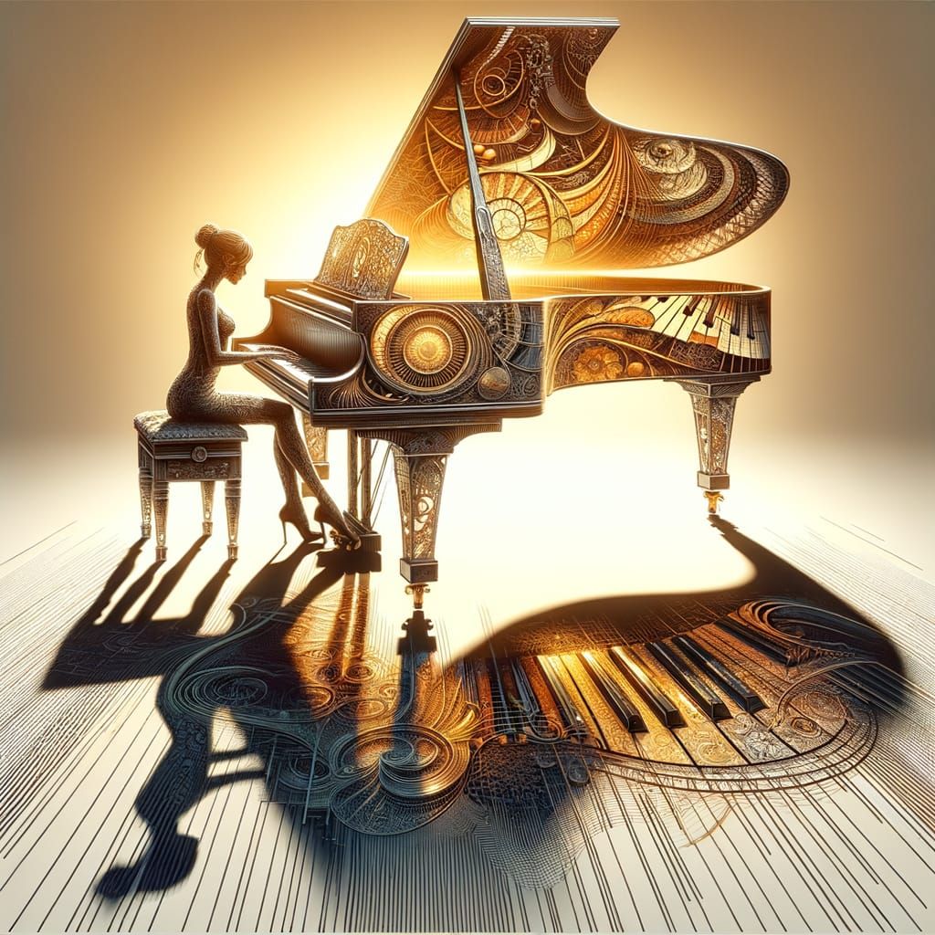 A digital illustration shows a woman's silhouette playing a grand piano with double exposure of the four seasons. Golden hour lighting and cell-shading create impressive shadows, set against a white backdrop.
