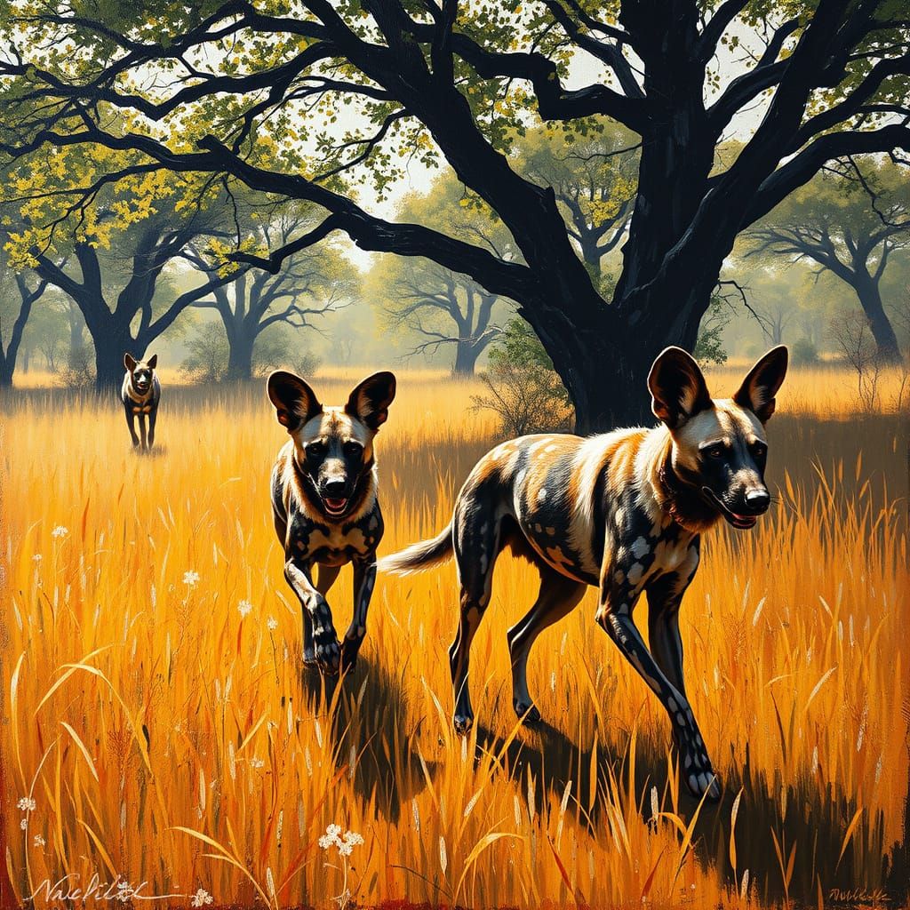 This image shows African wild dogs in a dynamic, textured style, reminiscent of acrylic impasto paintings. The scene features tall golden grass and dramatic chiaroscuro contrasts, evoking the works of expressive artists.