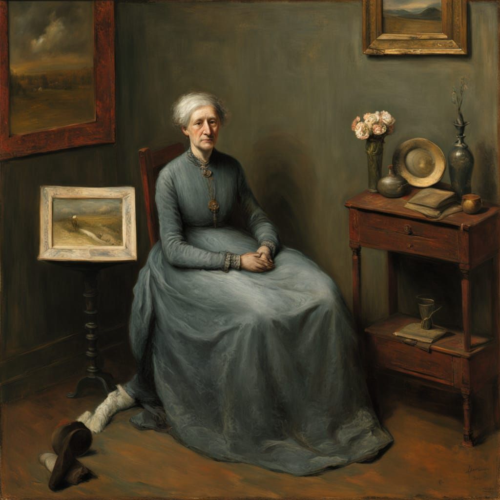 A muted post-impressionistic painting reminiscent of James Whistler's Mother. The artwork depicts a sleepless poet in a tiny garret room, rendered as a velvet painting.