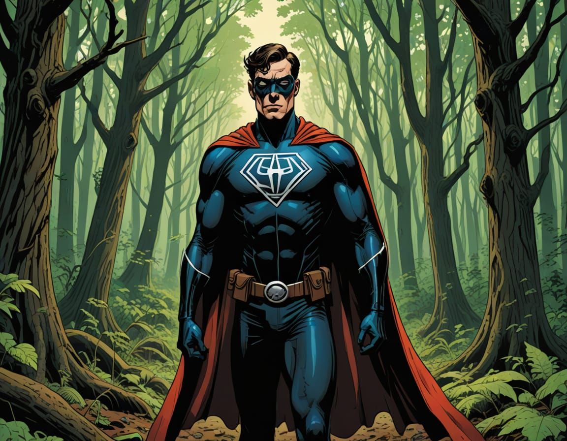 This image depicts a superhero character emerging from a dark and mystical forest in a vibrant comic book art style, blending fantasy and action elements.