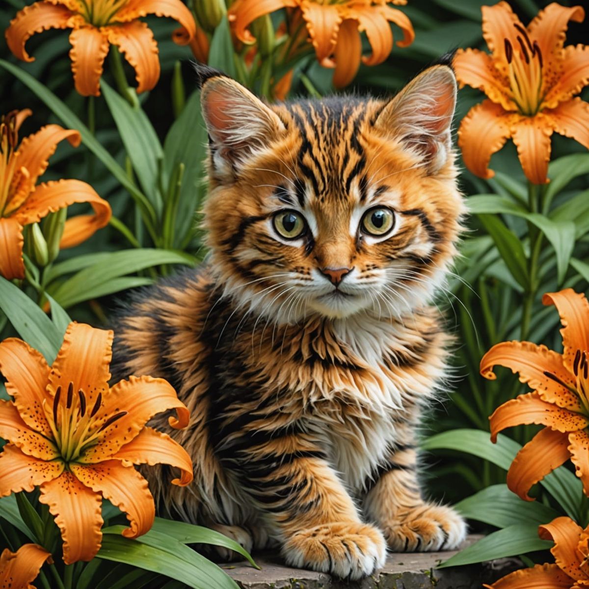 A striking picture of an orange kitten nestled among vibrant tiger lilies, reminiscent of Pre-Raphaelite paintings with its intricate details and classical beauty.