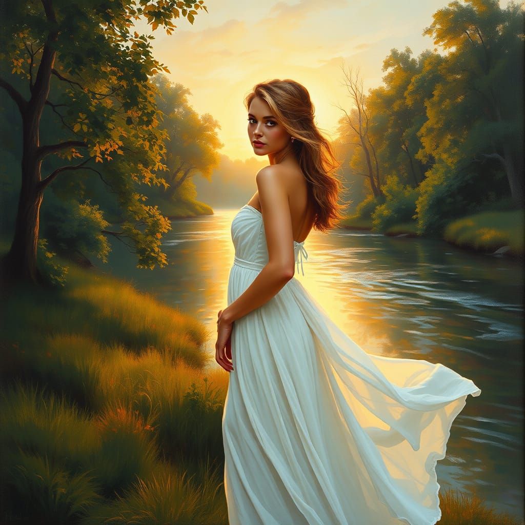 This image shows a woman in a white dress by a river at sunset, surrounded by trees. The artwork is in a realistic oil painting style, with visible brushstrokes and vibrant colors.