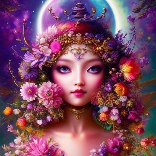 This image shows a charming, stylized portrait of a baby forest gremlin with a large head and bright eyes, set in a hyperdetailed Rococo-inspired landscape with vibrant colors and gemstone iridescence.