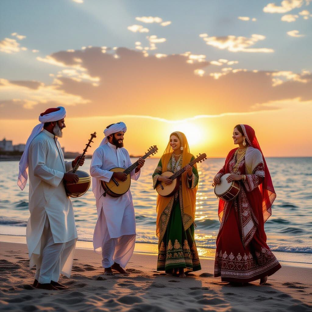A cinematic photo capturing traditional Bushehri people dancing joyfully on a sandy beach at sunset. Features authentic clothing, instruments, and golden hour lighting.