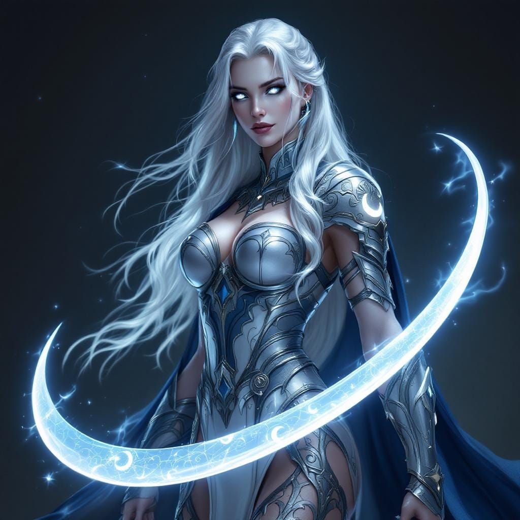 This image depicts Diana, the Scorn of the Moon, a powerful warrior with moonlit skin and silver hair, wielding a glowing lunar blade. Rendered in a hyperrealistic, painterly style with cinematic lighting.